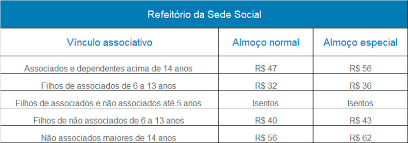 Para a Sede Social foram reajustados os valores do almoço normal e do especial.
