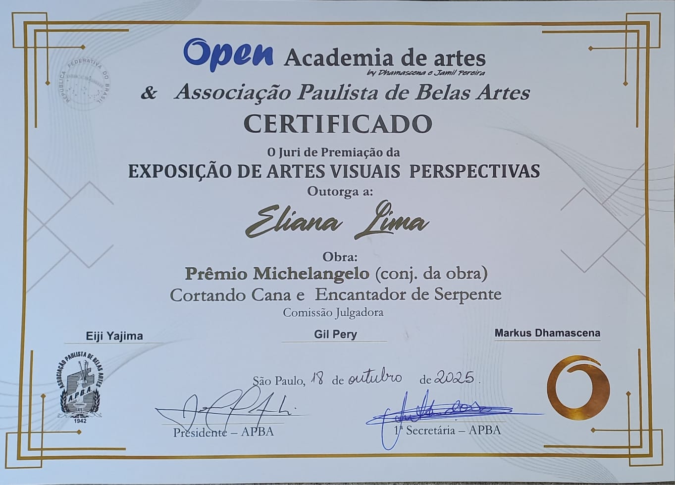 A acadêmica Eliana Jesus de Lima Santos (cadeira nº 9 de Artes) participou da exposição de Artes Visuais Perspectivas, promovida pela OPEN Academia de Artes e pela APBA (Associação Paulista de Belas Artes), e recebeu o 1º lugar pelo conjunto da obra com dois quadros: Cortando cana e Encantador de serpente.