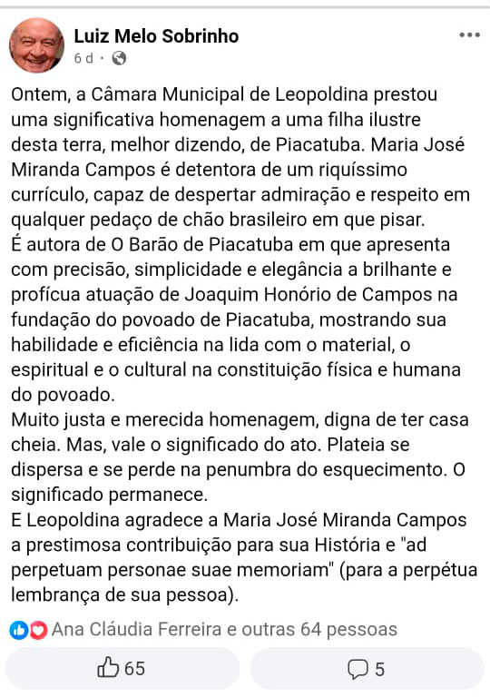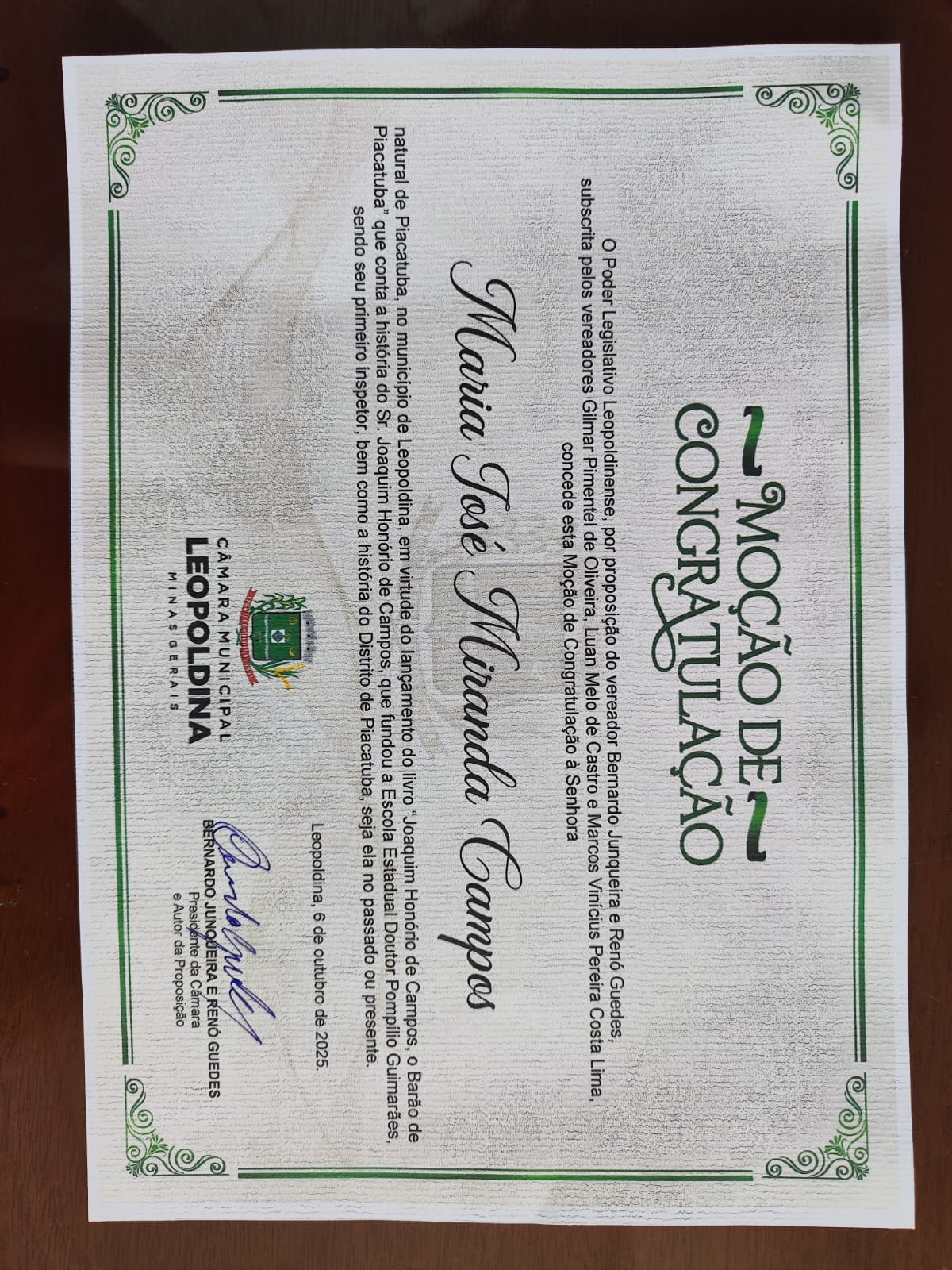 No dia 28 de outubro, a acadêmica Maria José Miranda Campos (cadeira nº 16 de Letras) recebeu das mãos do presidente da Câmara de Vereadores de Leopoldina/MG, Bernardo Junqueira, a Moção de Congratulação pelo lançamento de sua obra literária Joaquim Honório de Campos, o barão de Piacatuba.